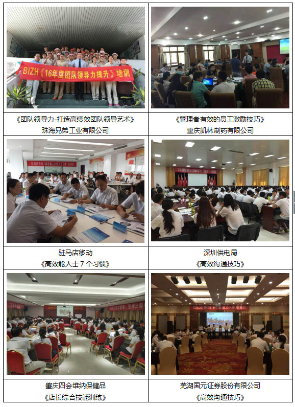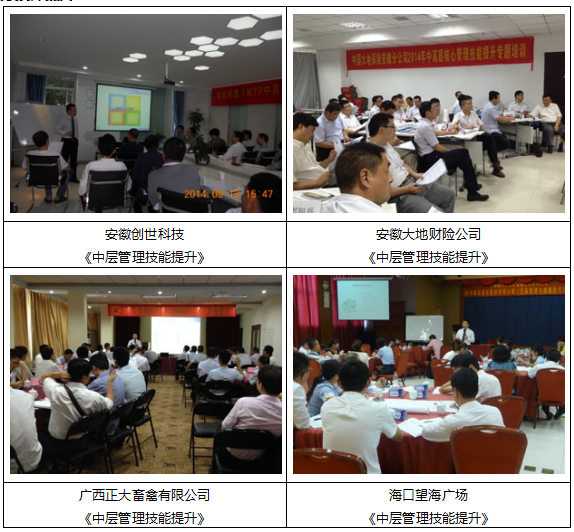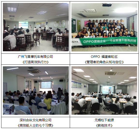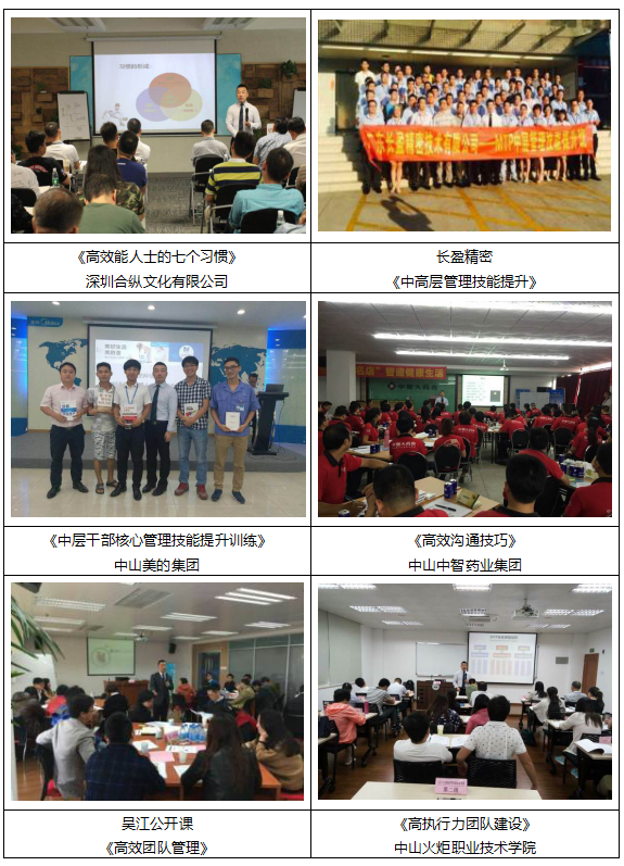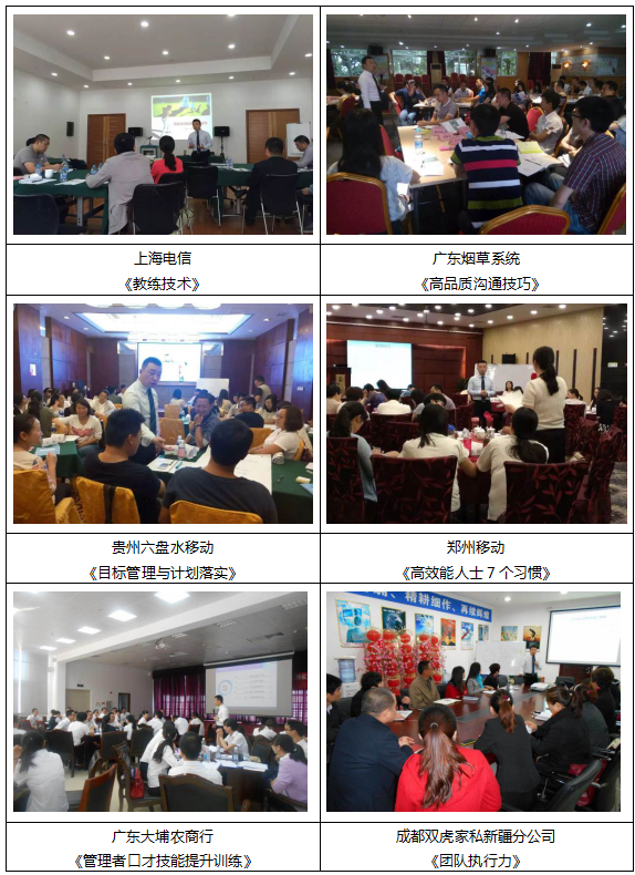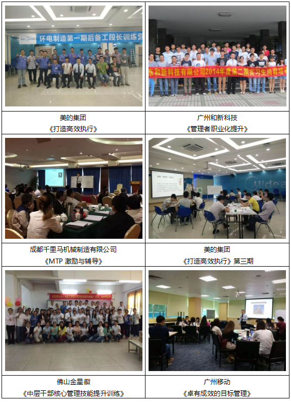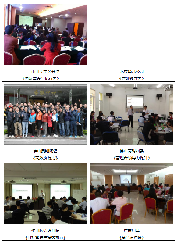 政府事業(yè):廣州市規(guī)劃局海珠區(qū)分局、廣州市職業(yè)能力培訓(xùn)指導(dǎo)中心、廣州市天河區(qū)人力資源和社會(huì)保障局、廣州越秀資產(chǎn)管理有限公司、廣東省郵政局函件中心、廣州設(shè)計(jì)院、暨南大學(xué)管理學(xué)院、中山大學(xué)繼續(xù)教育學(xué)院、南昌大學(xué)EMBA總裁班、佛山市高明團(tuán)委、佛山市水業(yè)集團(tuán)有限公司、廣州特種承壓設(shè)備檢測(cè)研究院、順德電力設(shè)計(jì)院、昆明供電設(shè)計(jì)院有限公司、中山火炬職業(yè)技術(shù)學(xué)院干部綜合能力提升培訓(xùn)班……