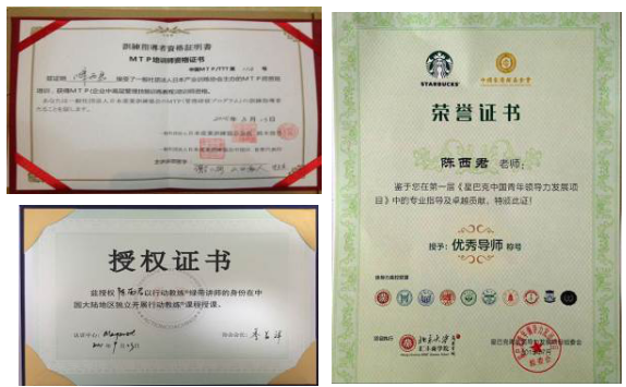 ● 2010年,陳老師師從國(guó)內(nèi)著名領(lǐng)導(dǎo)力專家,現(xiàn)任北京大學(xué)匯豐商學(xué)院領(lǐng)導(dǎo)力研究中心執(zhí)行主任的楊思卓老師,獲得親傳《六維領(lǐng)導(dǎo)力》課程,并獲得課程授權(quán)。