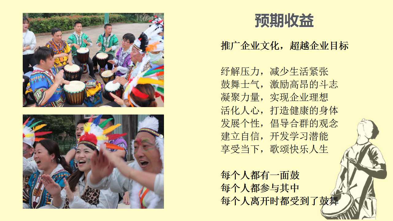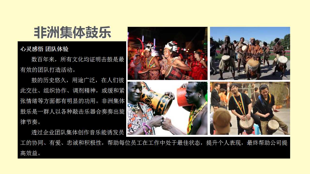 數(shù)百年來,所有文化均證明擊鼓是最 有效的團(tuán)隊打造活動。 鼓的歷史悠久,用途廣泛,在人們彼 此交往、組織協(xié)作、調(diào)劑精神,或緩和緊 張情緒等方面都有明顯的功用。非洲集體 鼓樂是一群人以各種敲擊樂器合奏奏出旋 律節(jié)奏。