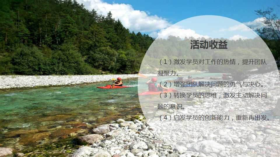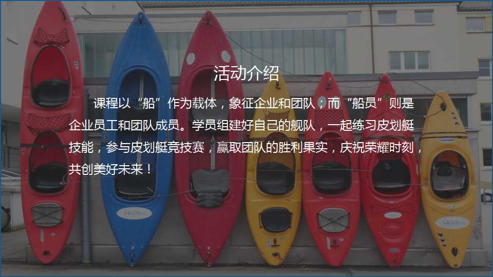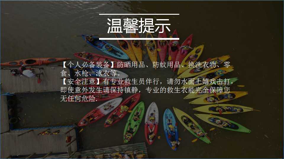 皮劃艇團建,以“船”作為載體,象征企業(yè)和團隊;而“船員”則是企業(yè)員工和團隊成員。組建好自己的艦隊,參與皮劃艇競技賽,贏取團隊的勝利果實,慶祝榮耀時刻,共創(chuàng)美好未來! 乘舟游曳山水間,感受來自造物主的洗禮,放松自我,釋放激情!